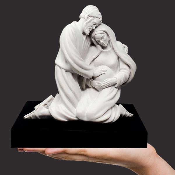 This is a pro-life image of the Nativity and Holy Family. Joseph’s gesture draws the viewer’s attention to Mary’s pregnant form. This solid resin-stone cast is left in its natural Carrara white color and is mounted on a solid matt black base. Timothy personally sculpts every original small masterpiece complete with his signature or monogram. Each replica is detailed by hand to the exacting standards of this modern day master sculptor.