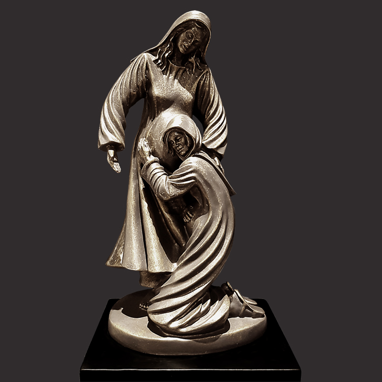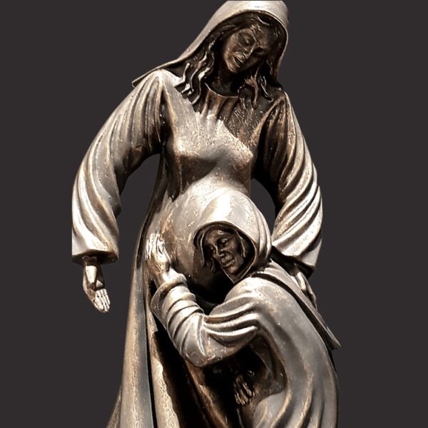 An intimate and heart- warming sculpture of the Visitation. Elizabeth shown on her knees with her ear on Mary’s pregnant stomach and her hand on her own. This solid resin-stone cast is coated in a realistic bronze finish and is mounted on a solid matt black base. Timothy personally sculpts every original small masterpiece complete with his signature or monogram. Each replica is detailed by hand to the exacting standards of this modern day master sculptor.